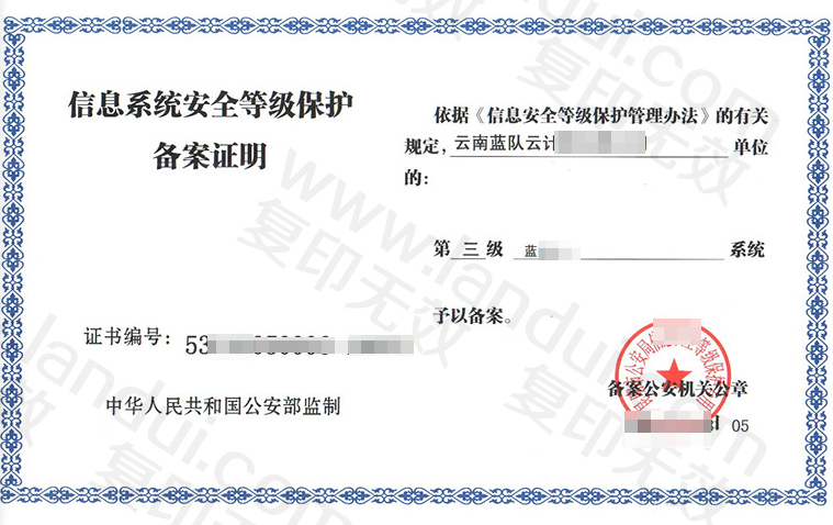合规证明:证明单位的信息系统已按国家要求完成等级保护备案,符合《网络安全法》《数据安全法》等法律法规中 “关键信息基础设施和重要信息系统需落实等级保护制度” 的强制性要求。